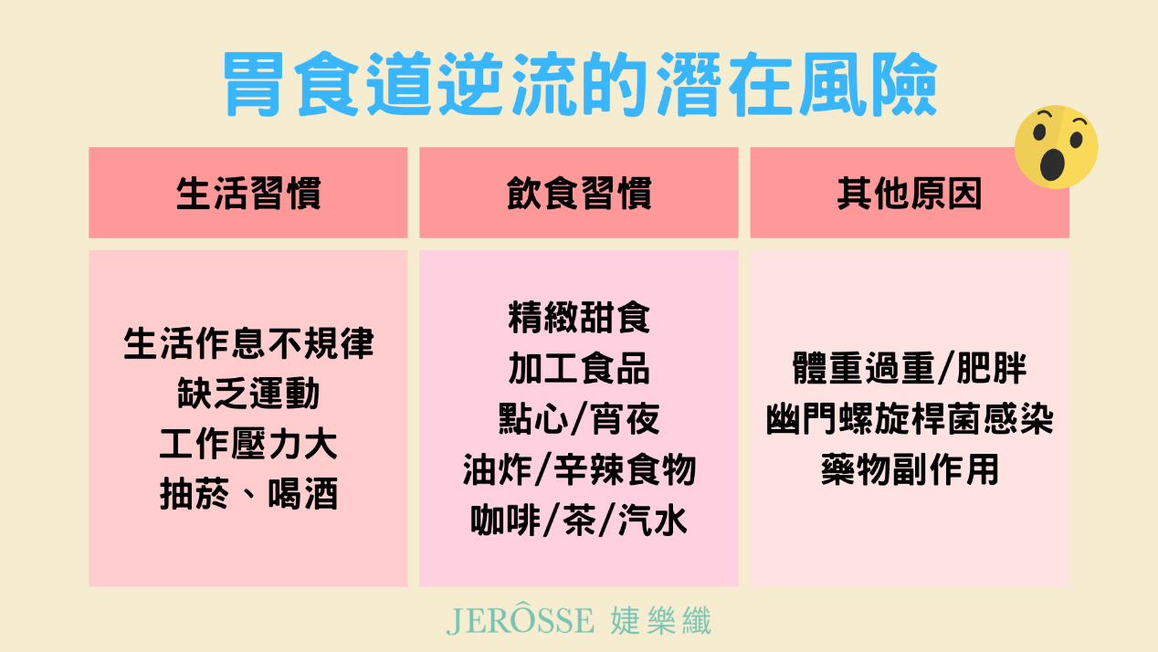胃食道逆流是現代人常見的文明病,在台灣的盛行率約25%,也就是說每4人就有1人有胃食道逆流。典型症狀除了有胸口灼熱感(俗稱火燒心),常見的還有咽喉疼痛、吞嚥困難和喉嚨沙啞等等,較嚴重的症狀則有胸悶胸痛、呼吸困難、耳鳴和中耳炎等。想知道如何改善和預防嗎?讓婕樂纖營養師教你3妙招,擊破惱人的胃食道逆流吧!
