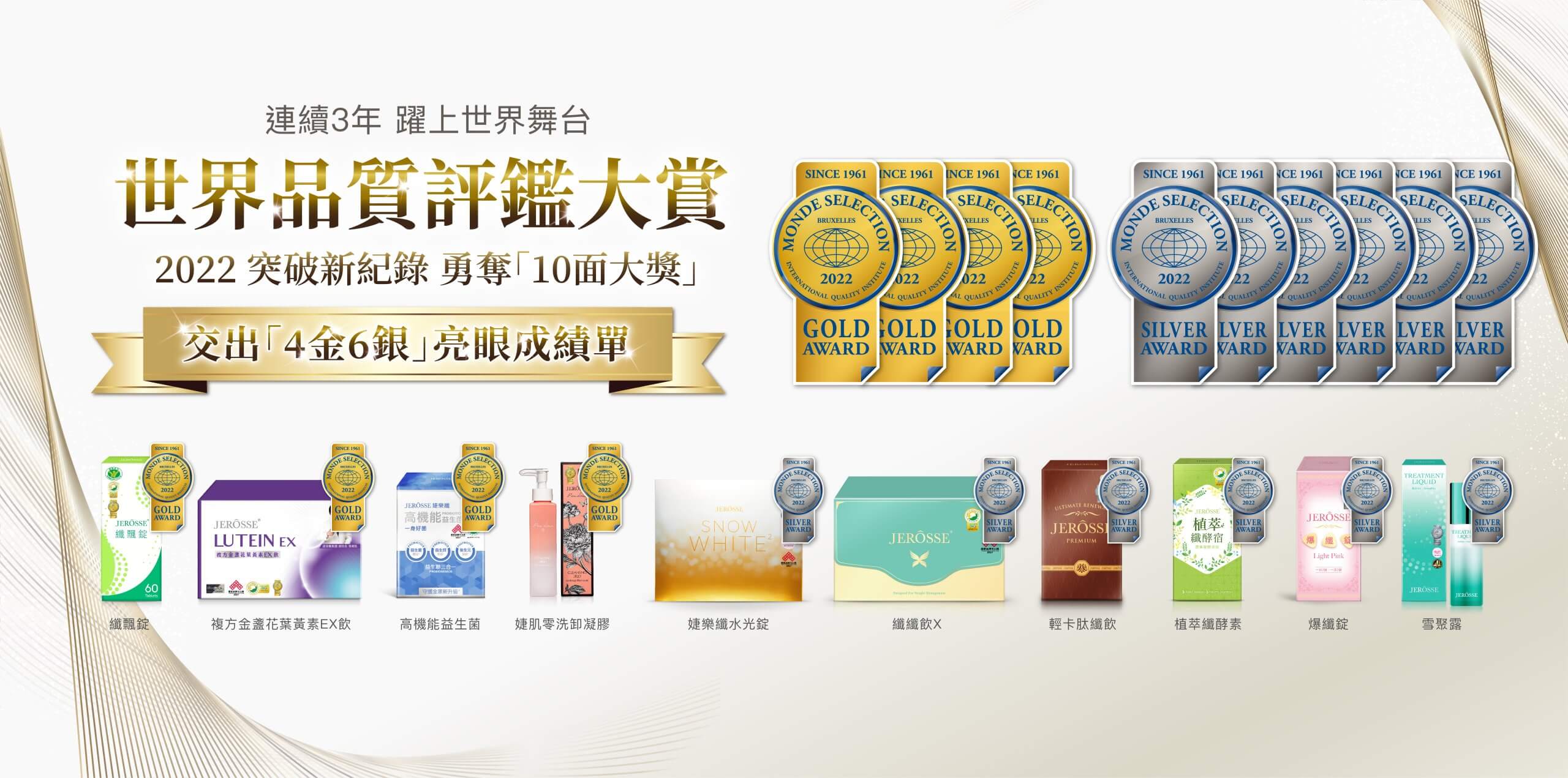 婕樂纖共10支產品獲獎,其獲獎產品為「健字號纖飄錠」「高機能益生菌」、「複方金盞花葉黃素EX飲」、「婕肌零洗卸凝膠」,「水光錠」、「纖纖輕鬆飲X」、「爆纖錠」、「輕卡肽纖飲」、「植萃纖酵宿」、「雪聚露雙效導入精華」,得獎產品跨足體重管理、美容保養、健康機能,全方位守護國人健康與美麗。