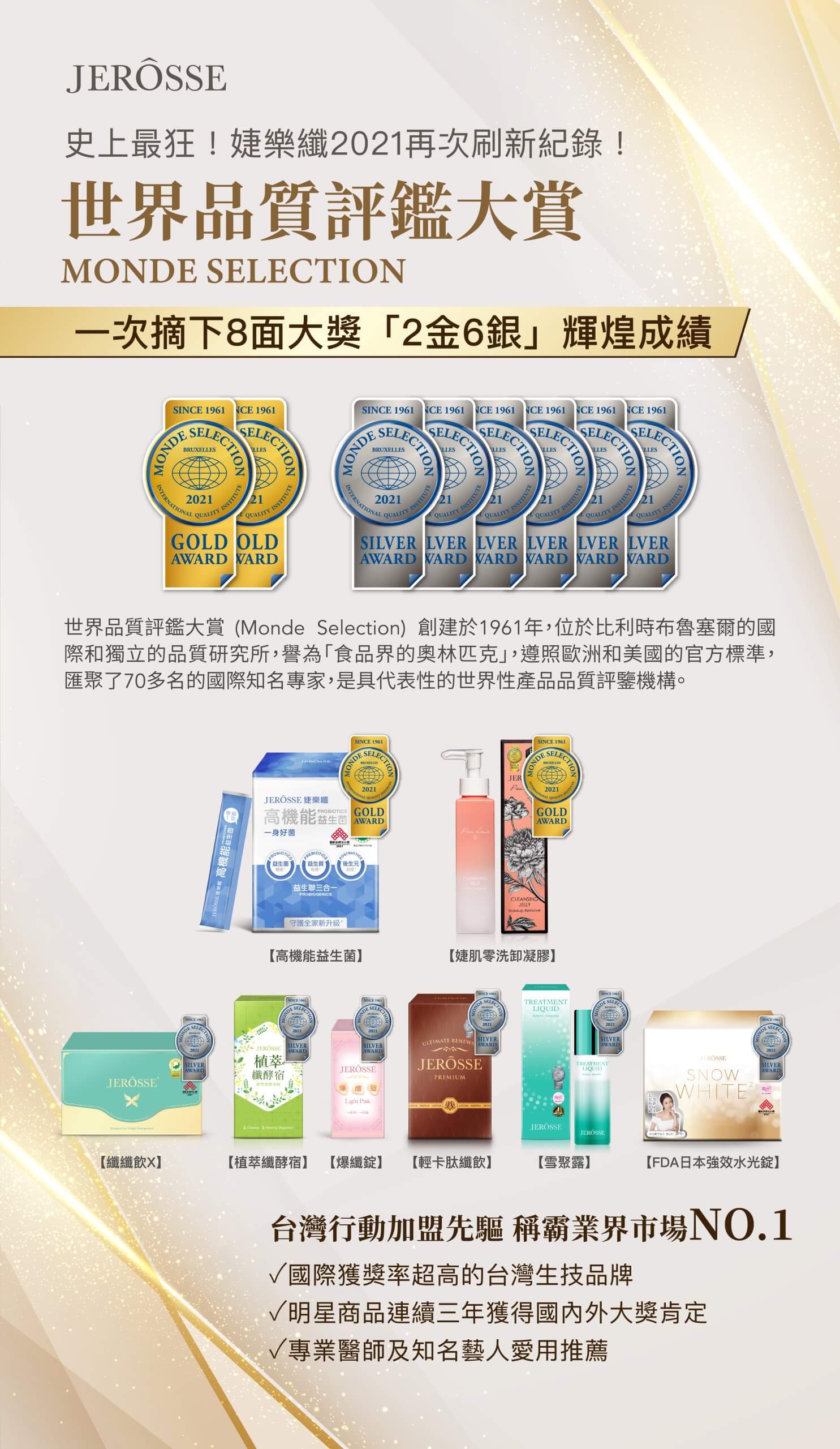 婕樂纖創下連續2年Monde Selection世界品質評鑑大賞得獎佳績,在品牌創辦人呂世博的帶領下,婕樂纖2021年一舉奪下2面金牌6面銀牌,共8面獎牌,再次證明婕樂纖為國際認可的優質高品質生技公司,其產品實力驚人堪稱業界表率!