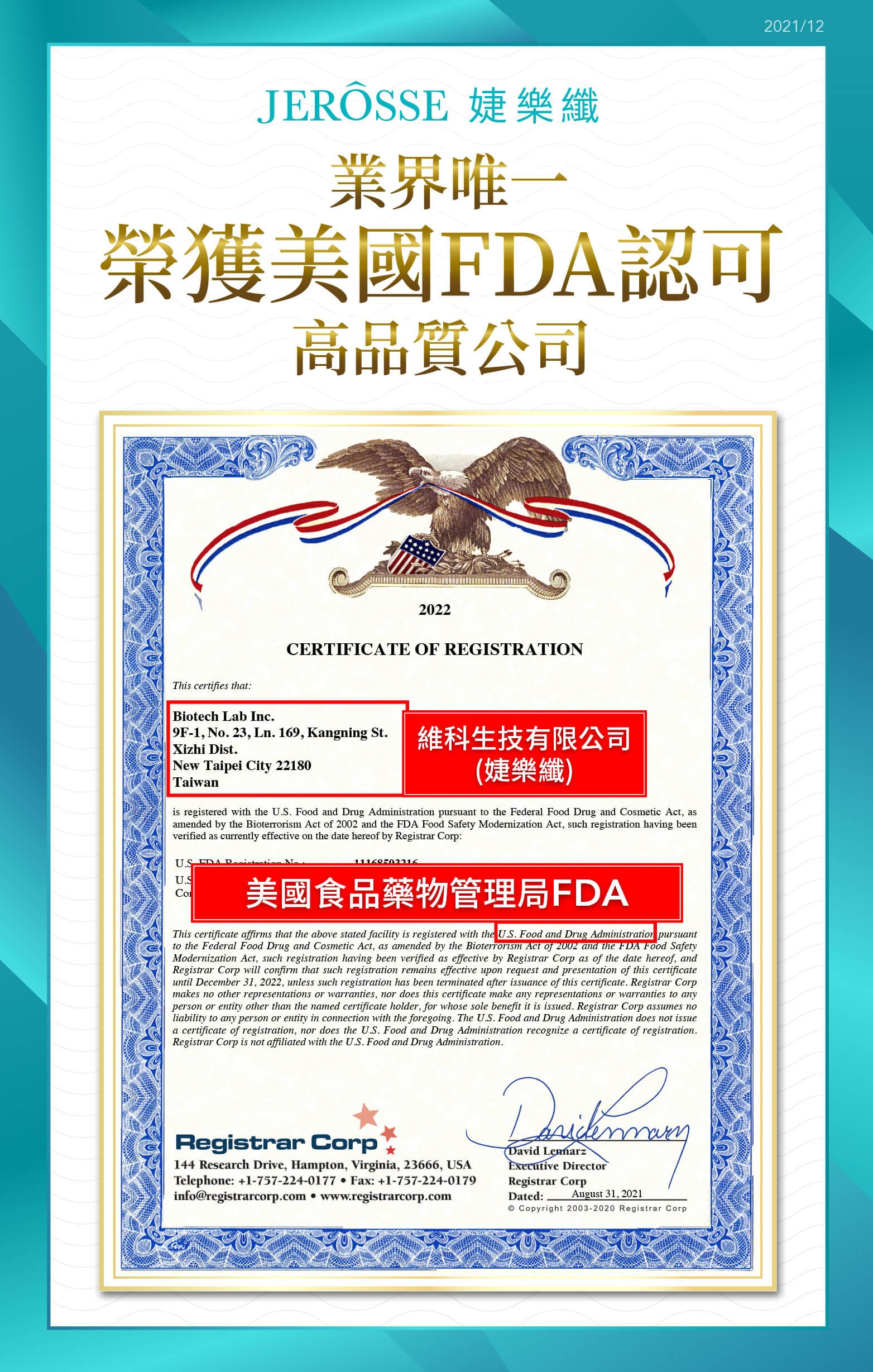 婕樂纖產品生產前需先經過三個階段分別測試與確認產品功效,在過程中參考了國外科學文獻、國內政府相關資料、使用者盲測回饋等多種機制,以達到優質的配方效果,並在GMP規範工廠進行生產製造,全程參與產品品質,透過定期SGS檢驗及第三方公正單位認證,投保兩億的產品責任險,以確保消費者權益,秉持追求卓越的精神,持續優化產品品質,真正做到從原料篩選、產品配方、生產製造、品質檢驗、產品負責等完整監督作業,因此,獲得了美國FDA(食品藥品監督管理局)認可的高品質公司,婕樂纖以行動實踐企業永續發展的最高理念。