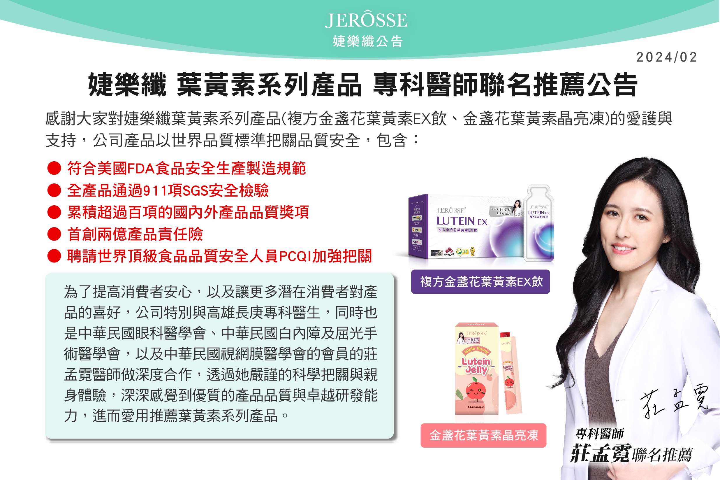 感謝專科醫師莊孟霓對葉黃素系列產品的愛用支持,希望未來有機會,可以看到莊孟霓專科醫師分享更多養身與健康知識,也透過他的嚴格把關,讓更多消費者用起來安心,吃起來放心!