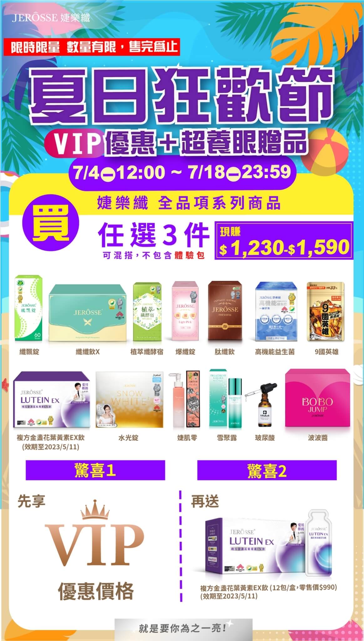 7月 #夏日狂歡節 限時限量優惠!手刀秒搶起來~~ 你、沒、看、錯現在只要購買 婕樂纖 #全系列產品 (任選3件,可混搭,不包含 #體驗包) #人人有獎 立馬享有 #三重好康驚喜 第一重 #現賺 $1,230~$1,590 第二重 再享...