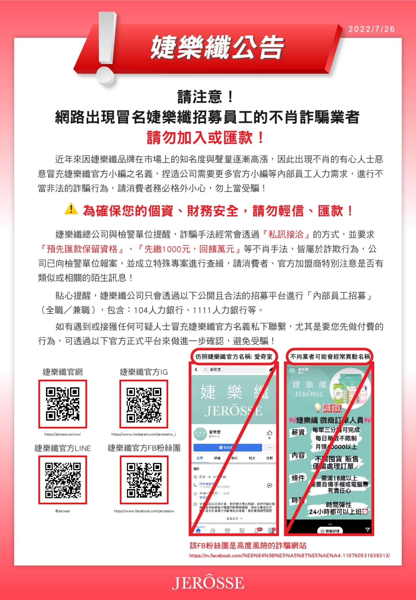 婕樂纖總公司與檢警單位提醒,詐騙手法經常會透過『私訊接洽』的方式,並要求『預先匯款保留資格』、『先繳1000元,回饋萬元』等不肖手法,皆屬於詐欺行為,公司已向檢警單位報案,並成立特殊專案進行查緝,請消費者、官方加盟商特別注意是否有類似或相關的陌生訊息!