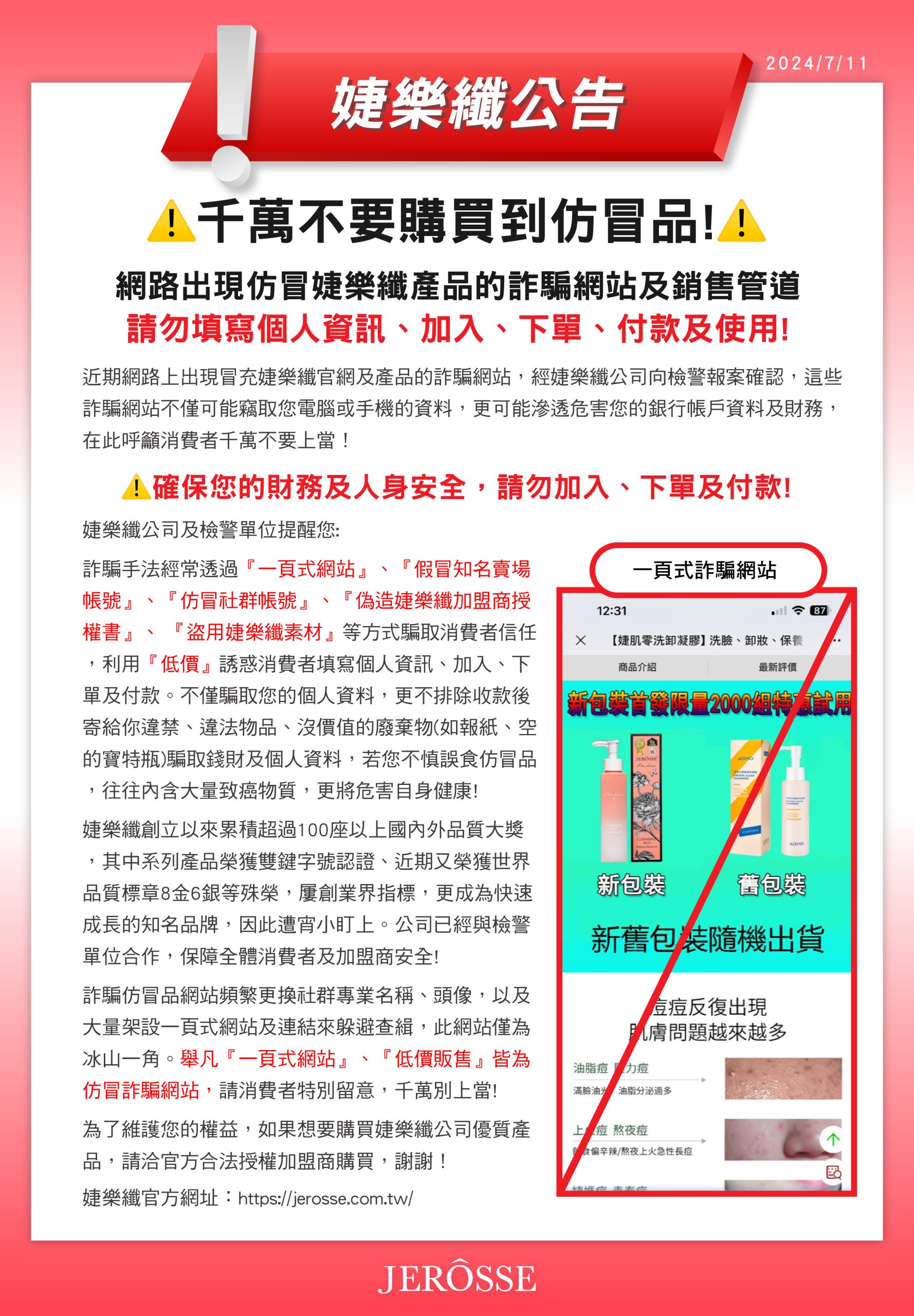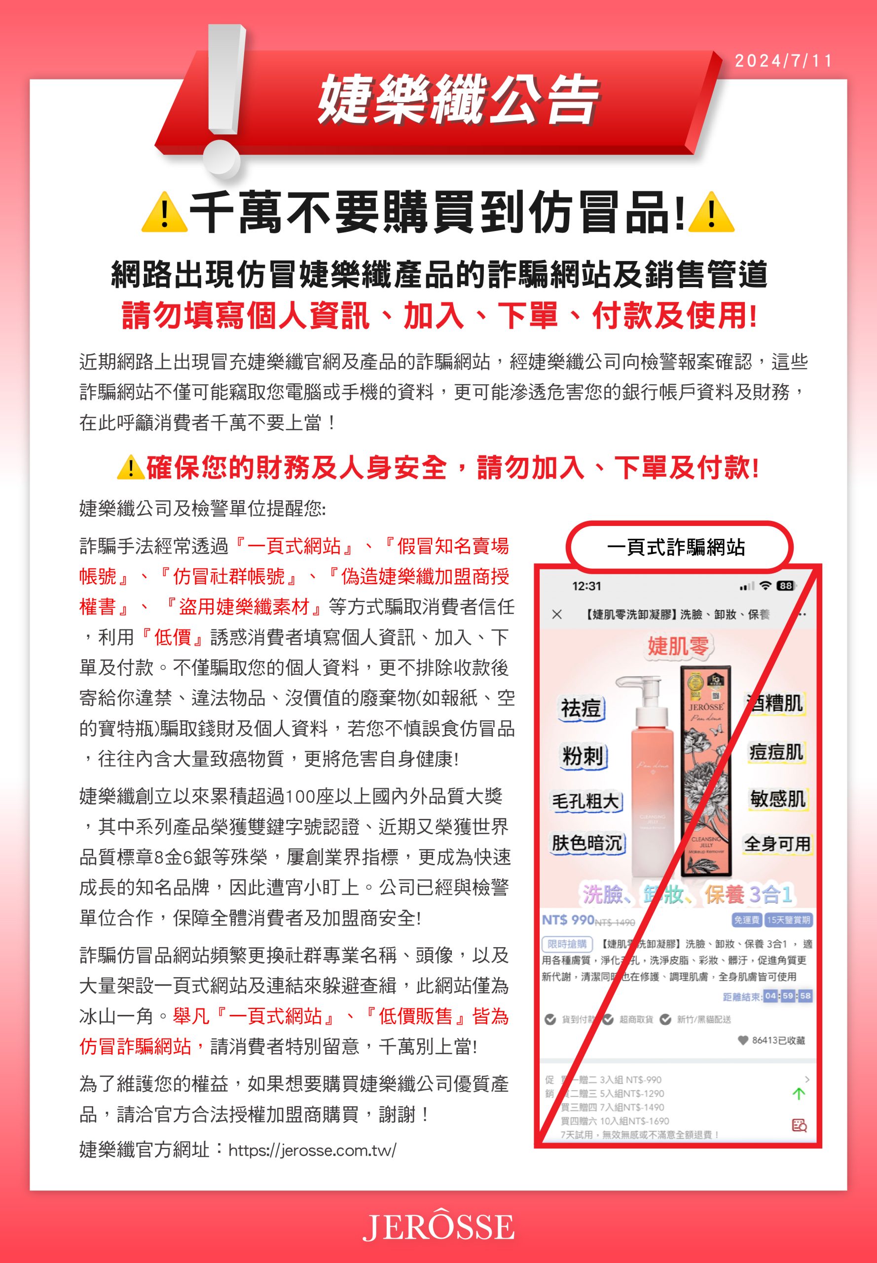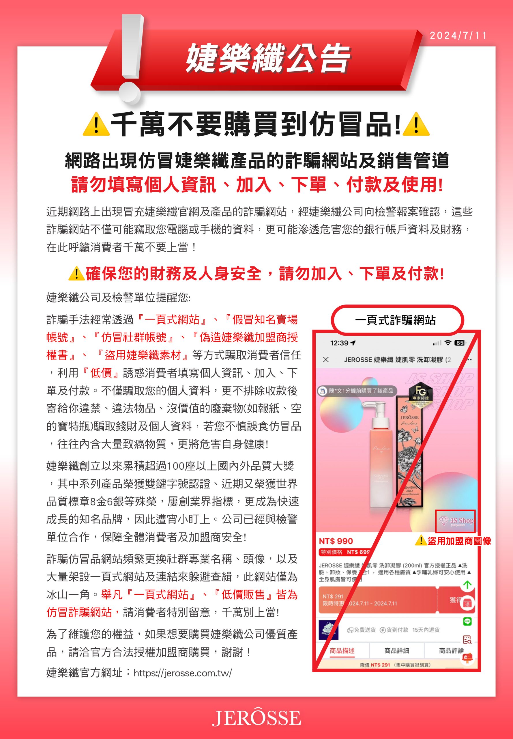 婕樂纖呼籲消費者,面對高度風險的仿冒品詐騙網站,請勿加入、下單、付款,以確保您個資安全‼