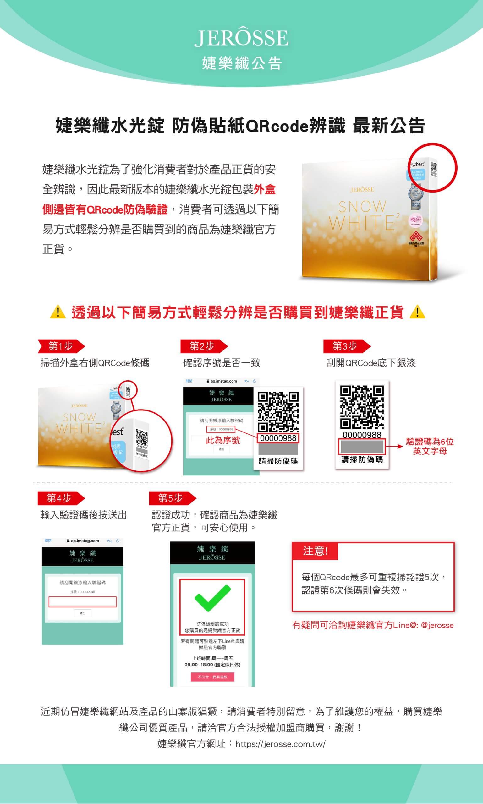 婕樂纖水光錠為了強化消費者對於產品正貨的安全辨識,因此最新版本的婕樂纖水光錠包裝外盒側邊皆有QRcode防偽驗證,消費者可透過以下簡易方式輕鬆分辨是否購買到的商品為婕樂纖官方正貨。 近期仿冒婕樂纖網站及產品...