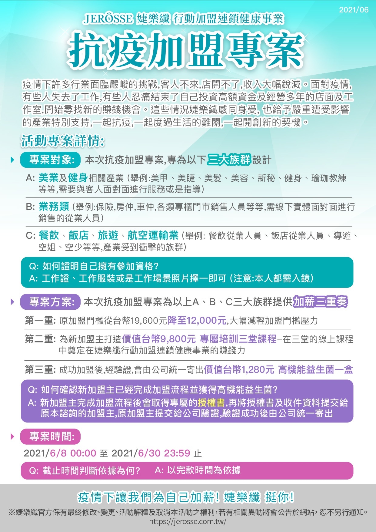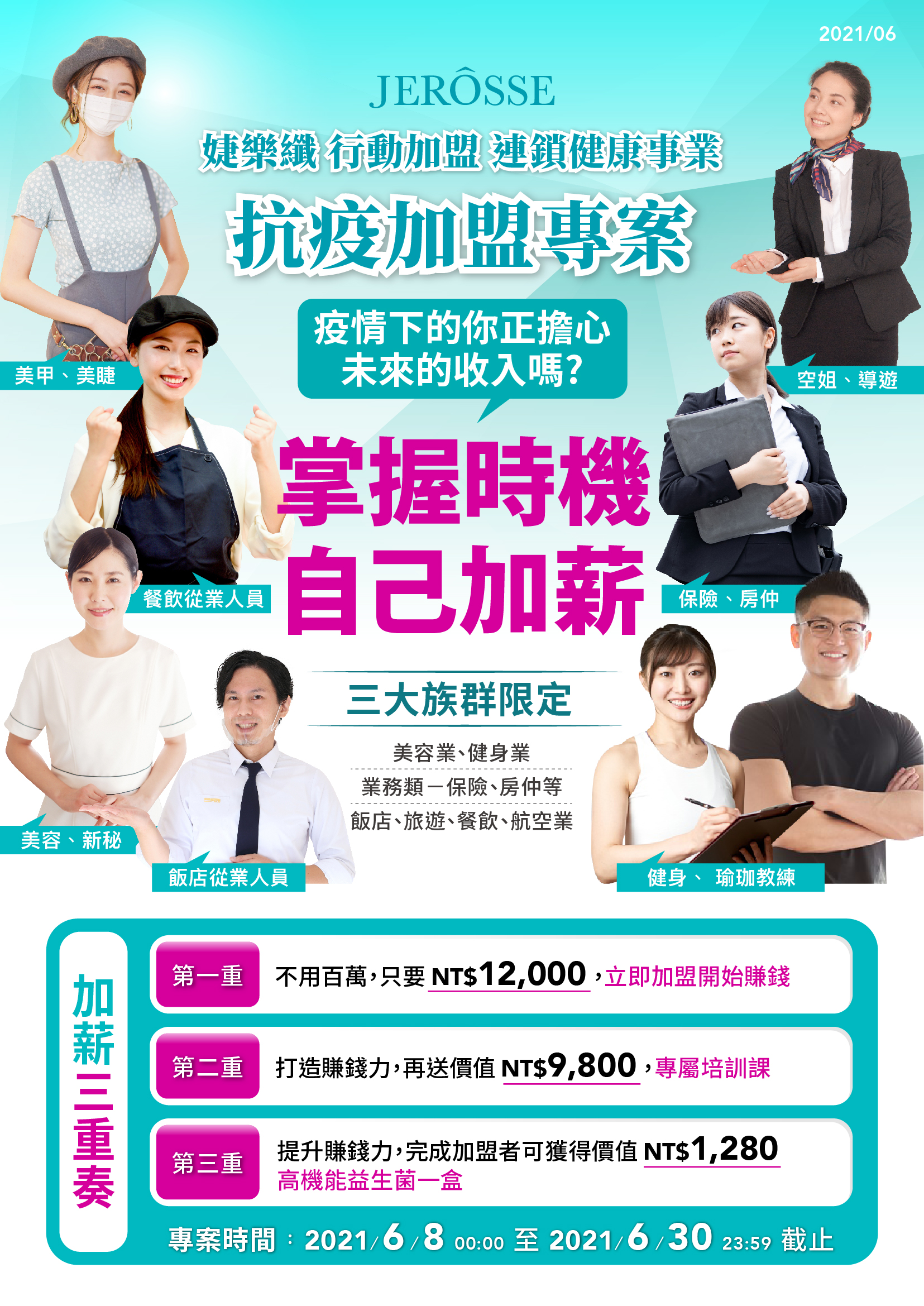 我們感受到了!為了受到疫情而影響收入的你,婕樂纖行動加盟連鎖健康事業特別推出「抗疫加盟專案」,陪你一起抗疫,一同開創新契機!