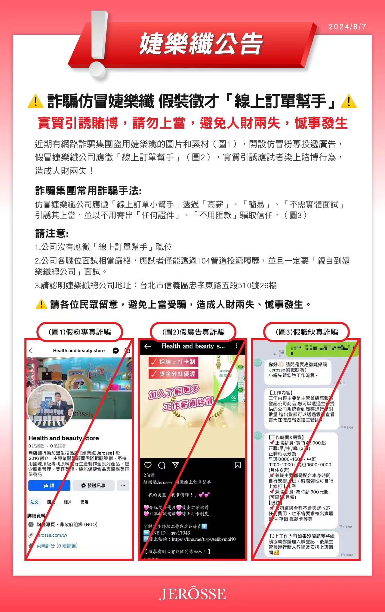 網路詐騙層出不窮,近期有網路詐騙集團盜用婕樂纖公司的圖片和素材(EDM中圖1),開設仿冒粉專投遞廣告,假冒婕樂纖公司應徵「線上訂單幫手」(EDM圖2),實質引誘應試者染上賭博行為,造成人財兩失,憾事發生!
