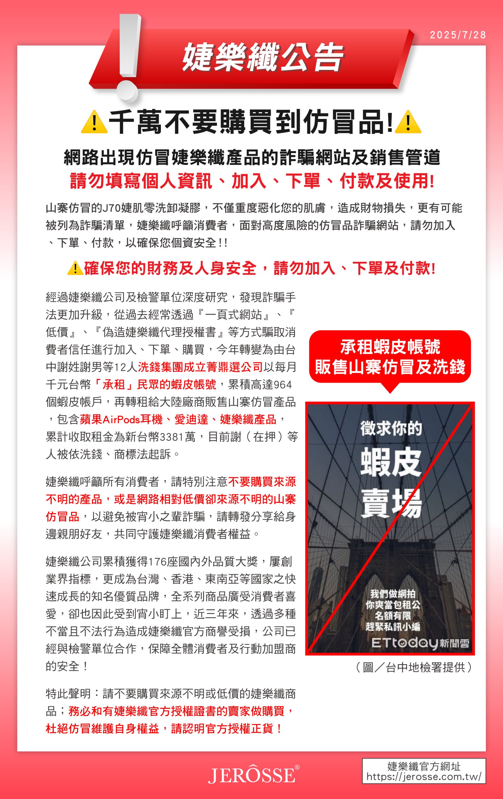 婕樂纖呼籲所有消費者,請特別注意不要購買來源不明的產品,或是網路相對低價卻來源不明的山寨仿冒品,以避免被宵小之輩詐騙,請轉發分享給身邊親朋好友,共同守護婕樂纖消費者權益。