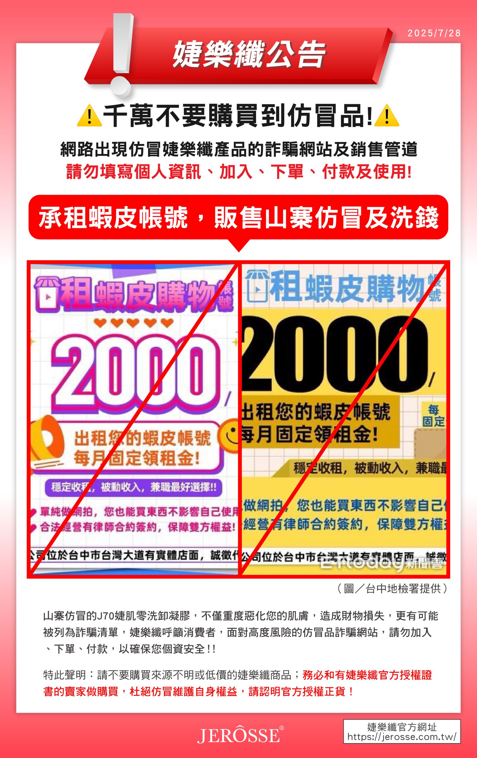 山寨仿冒的J70婕肌零洗卸凝膠,不僅重度惡化您的肌膚,造成財物損失,更有可能被列為詐騙清單,婕樂纖呼籲消費者,面對高度風險的仿冒品詐騙網站,請勿加入、下單、付款,以確保您個資安全‼