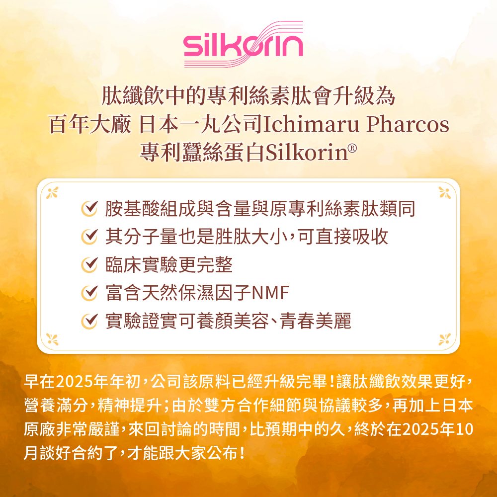 若消費者看到包裝上仍是舊版標示,可安心食用,因為內容物已包含專利蠶絲蛋白 Silkorin®。
