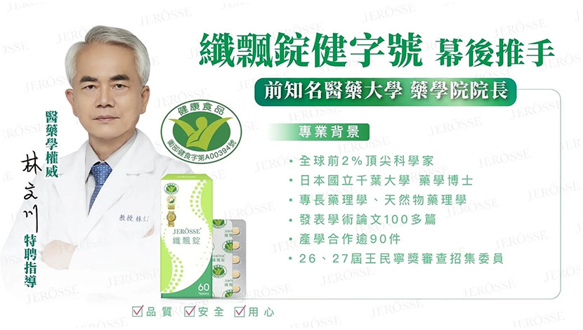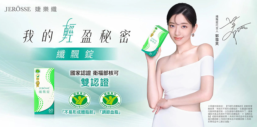 能讓愛惜羽毛的郭雪芙代言,產品力要過關。由全球前2%頂尖科學家林文川指導研發,與婕樂纖首席營養師林柏辰領軍的六位國考營養師團隊,把關消費者飲食狀態與健康,所推出的優質產品–婕樂纖 纖飄錠,也是市場上唯一具備雙健字號功效,三項國內外認證以及人體實驗結果的優質體重管理產品。