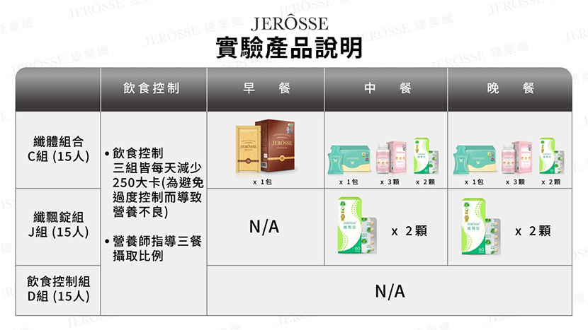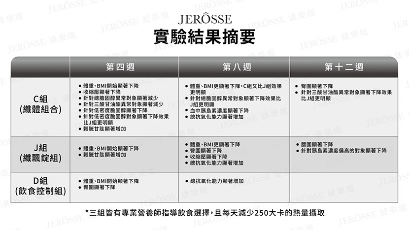 這項研究針對45位20~59歲、BMI≧27的肥胖者,分成三組,透過飲食控制,以每天減少250大卡為準,同時由專業營養師介入指導三餐的攝取比例,避免造成營養不良。結合生活型態的改變,同時搭配婕樂纖體重管理產品輔助。如C組早午晚三餐增加婕樂纖套裝組合*(1),J組午晚餐加入婕樂纖纖飄錠*(2),D組則僅有飲食控制,實驗介入為期90天,並在實驗後兩週額外進行回訪,證實體態控制不只是少吃多運動,而是要用科學方法來調整體質,既不易形成體脂肪,有效輔助調整血脂、調節血糖,體重更是顯著下降。